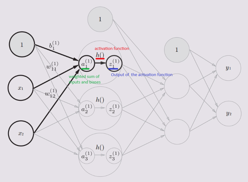 The weighted sum of the inputs and the bias is denoted in node a, then it is passed through the activation function \(h(x)\) to produce the output \(z\).